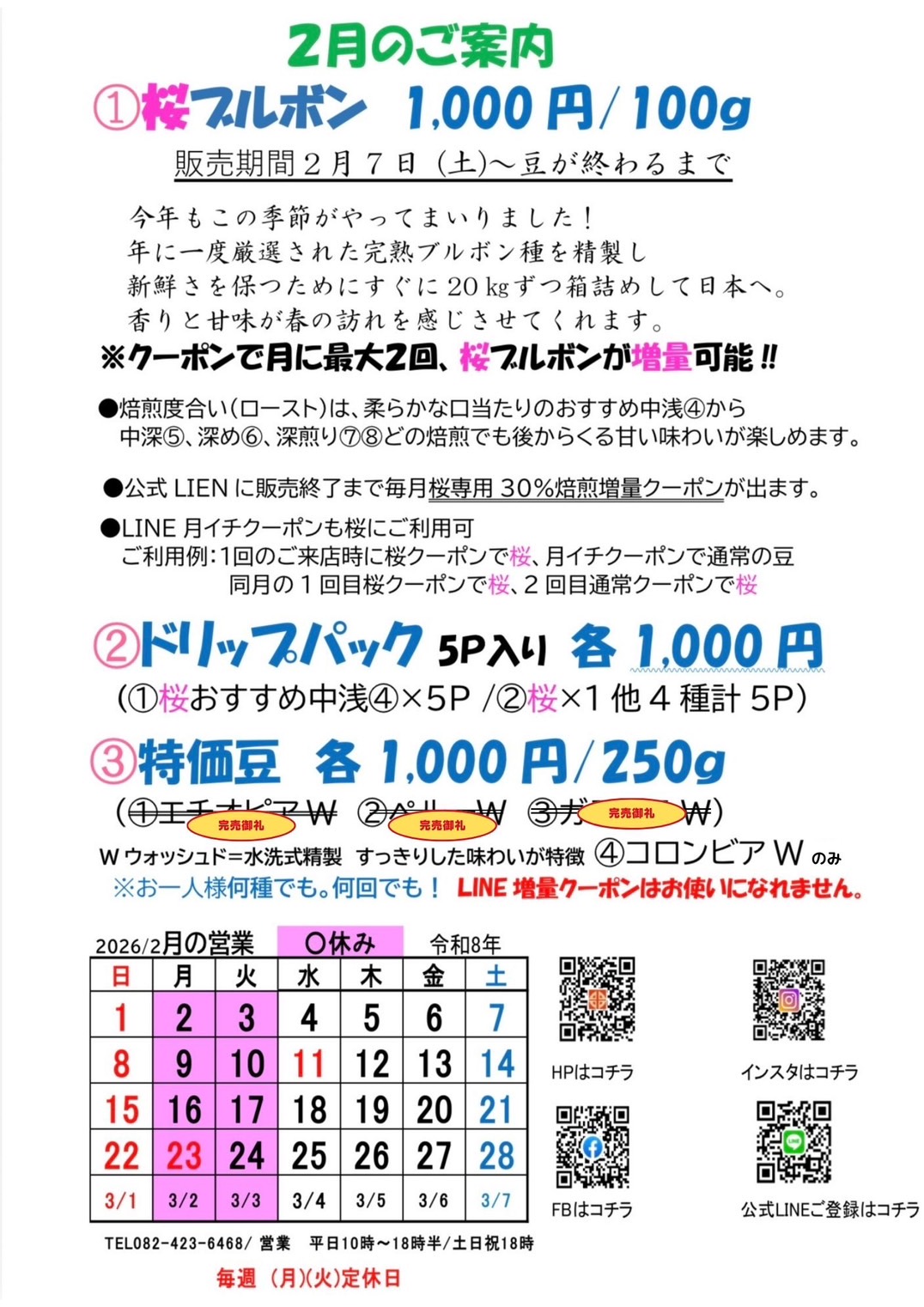桜専用30%焙煎増量クーポンもお作りいたしました!またドリップパック5P入りにも桜ブルボンをお入れして皆様のご用命を心よりお待ちしております。2月7日(土)から販売です。