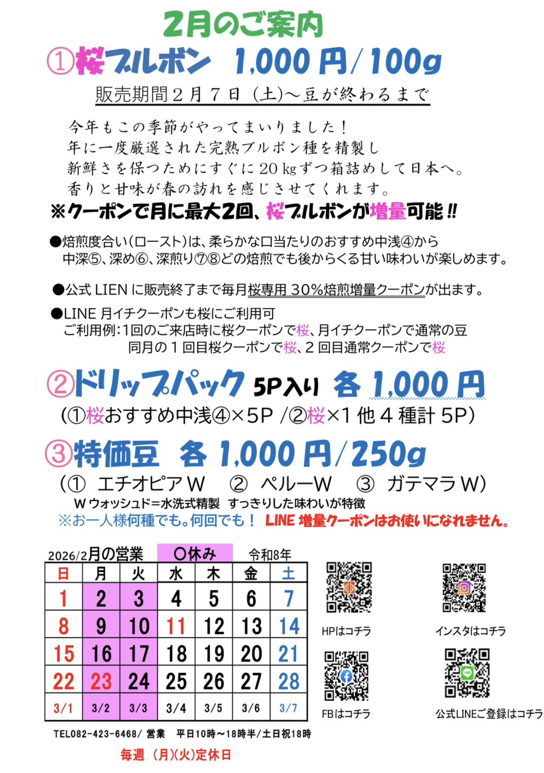 桜専用30%焙煎増量クーポンもお作りいたしました!またドリップパック5P入りにも桜ブルボンをお入れして皆様のご用命を心よりお待ちしております。販売は、2月7日(土)からです。